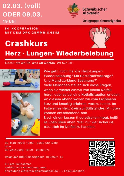 Auf Grund der großen Nachfrage gibt es einen weiteren Termin für den Kurs zur Herz-Lungen-Wiederbelebung. Ab sofort sind nur noch Anmeldungen für den Kurs am 9.März möglich.