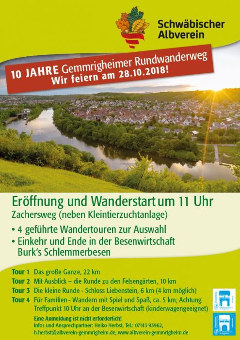 Der Gemmrigheimer Albverein bietet am 28. Oktober 2018 vier geführte Wandertouren in Erinnerung an die Eröffnung des Gemmrigheimer Rundwanderwegs vor zehn Jahren an. Zum Wanderstart trifft man sich um 11:00 Uhr vor der Kleintierzuchtanlage im Zachersweg. Am Ende der Wanderung ist eine Einkehr in der Besenwirtschaft Burk`s Schlemmerbesen geplant. Eine Anmeldung ist nicht erforderlich.