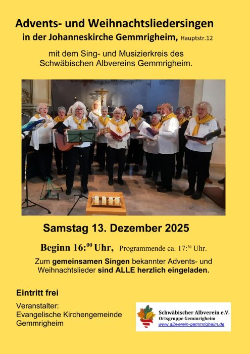 Auch in diesem Jahr findet wieder das Advents- und Weihnachtsliedersingen mit dem Sing- und Musizierkreis des Schwäbischen Albvereins statt.