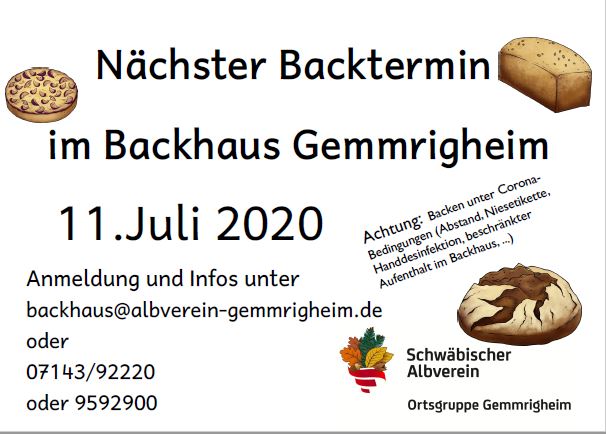 Nach langer Coronapause wird am Samstag, den 11.Juli das Gemmrigheimer Backhaus wieder angeheizt. Selbstverständlich halten wir uns an die aktuellen Hygieneregeln (Abstand, Nies-Etiquette, Handdesinfektion, beschränkter Aufenthalt im Backhaus…)
