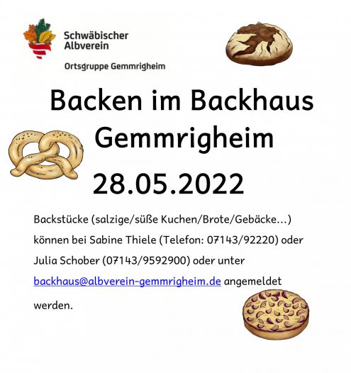Am Samstag, den 28.05. wird das Gemmrigheimer Backhaus wieder angeheizt. Gegen Voranmeldung können Brotteige und süße/salzige Kuchen (Hefeteig) vorbei gebracht werden.