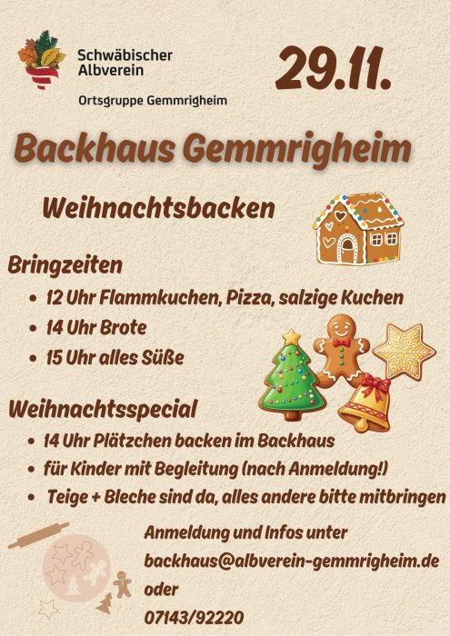 Backhaus Sa., 29.11.2025, Nähere Infos folgen: Organisation: Sabine Thiele Tel.: 07143 / 9 22 20 Email: Uhrzeit: 10:00 - 16:00 iCalendar Mit dem Laden der Karte akzeptieren Sie die Datenschutzerklärung von Google.Mehr erfahren Karte laden Google Maps immer entsperren zur Übersicht