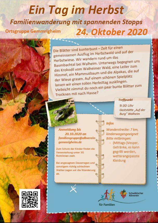 am 24.Oktober im Herbstwald und auf der Herbstwiese. Gewandert wird rund um das Baumbachtal bei Walheim. Unterwegs begegnen uns das Krokodil vom Walheimer Wald, eine Leiter zum Himmel, ein Mammutbaum und die Alpakas, die auf der Wiese grasen. Überm Lagerfeuer wird die vielleicht letzte rote Wurst des Jahres gegrillt. Auf einem schönen Spielplatz lassen wir einen tollen Herbsttag ausklingen.