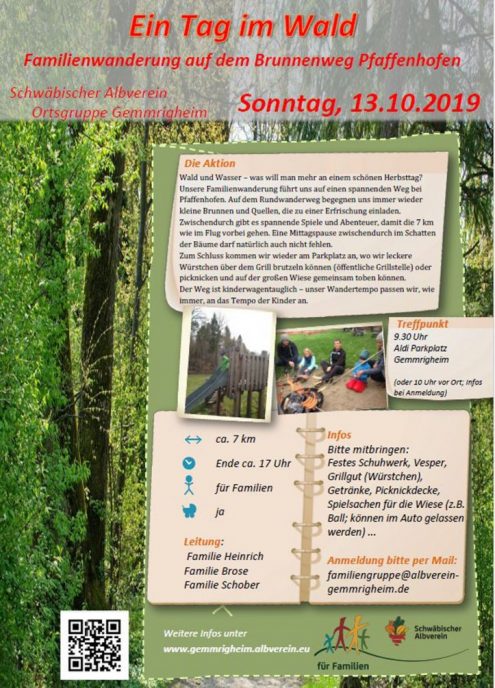Die Familienwanderung führt am 13.10.2019 auf einen spannenden Weg bei Pfaffenhofen. Auf dem Rundwanderweg begegnen der Gruppe immer wieder kleine Brunnen und Quellen, die zu einer Erfrischung einladen. Zwischendurch gibt es spannende Spiele und Abenteuer, damit die 7 km wie im Flug vorbei gehen. Eine Mittagspause zwischendurch im Schatten der Bäume darf natürlich auch nicht fehlen. Die Runde endet wieder am Parkplatz, wo leckere Würstchen über dem Grill gebrutzelt werden können. Außerdem lädt die große Wiese zum Spielen und Toben ein. Der Weg ist Kinderwagentauglich – das Wandertempo wird, wie immer, an das Tempo der Kinder angepasst.