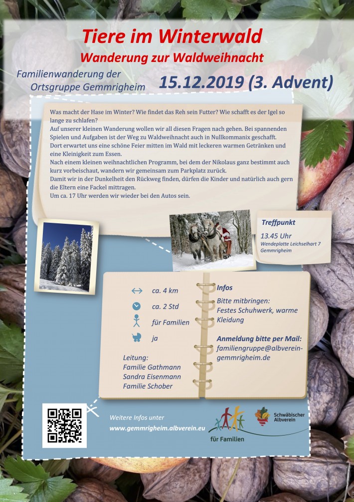 Auf einer kleinen Wanderung am 15.12.2019 können Familien all diesen Fragen nach gehen. Bei spannenden Spielen und Aufgaben ist der Weg zu Waldweihnacht der Ortsgruppe Gemmrigheim auch in Nullkommanix geschafft.