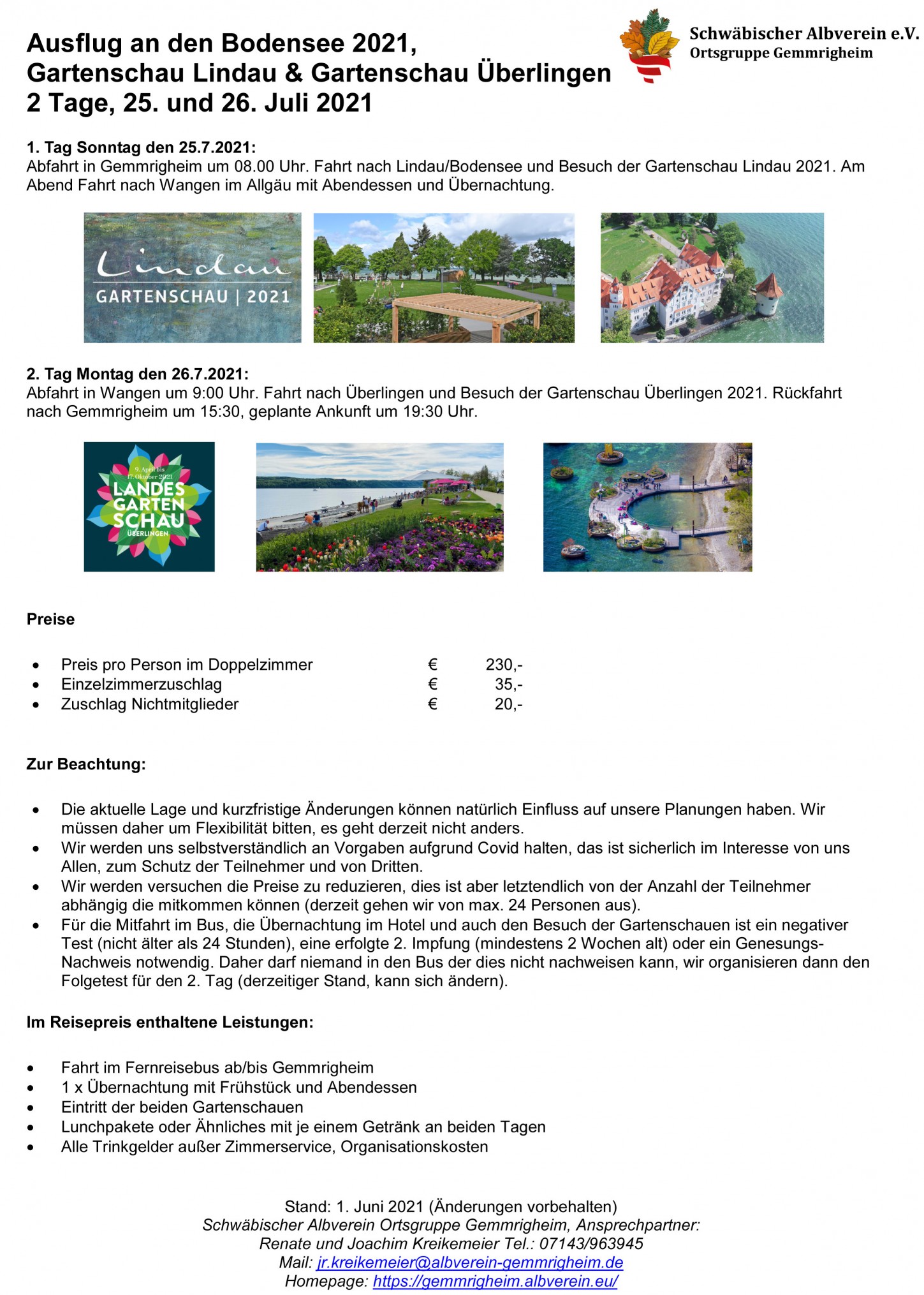 Übernachtet wird in Wangen im Allgäu bevor es am zweiten Tag an den badischen Teil des Sees geht. Dort steht ein Besuch der Landesgartenschau in Überlingen an, bevor es am Abend wieder nach Hause geht.