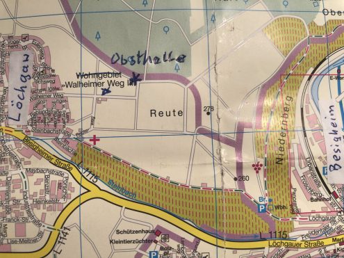 - Möglichkeit: In Löchgau (von Besigheim kommend) auf der Besigheimer Str. bei der ersten Kreuzung in die Neusatzstrasse, dann 2. Querstrasse rechts in den Walheimer Weg und diesen immer gerade aus bis zur Obstanlage, dann links bis zum Waldrand, rechts weiter bis zur Obsthalle.