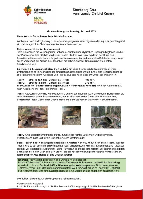 Ortsgruppe Gemmrigheim > Veranstaltungen > Gauwanderung Hirsau – Calw