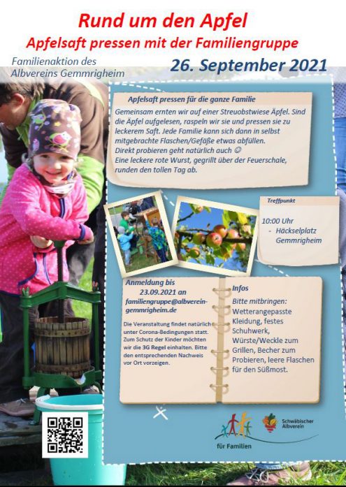 Am 26. September 2021 lädt die Familiengruppe der Ortsgruppe Gemmrigheim des Schwäbischen Albvereins alle Kinder und ihre Eltern zum Apfelsaft pressen ein.